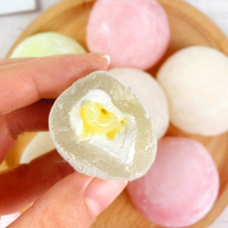大福,又名“雪媚娘”,是日本地道的点心之一, 外观细白,第一口咬到的是特别软糯Q弹的冰皮,里面是奶香怡人的淡奶油,裹着新鲜好吃的水果粒, 酸酸甜甜、口感丰富,特别受消费者欢迎。